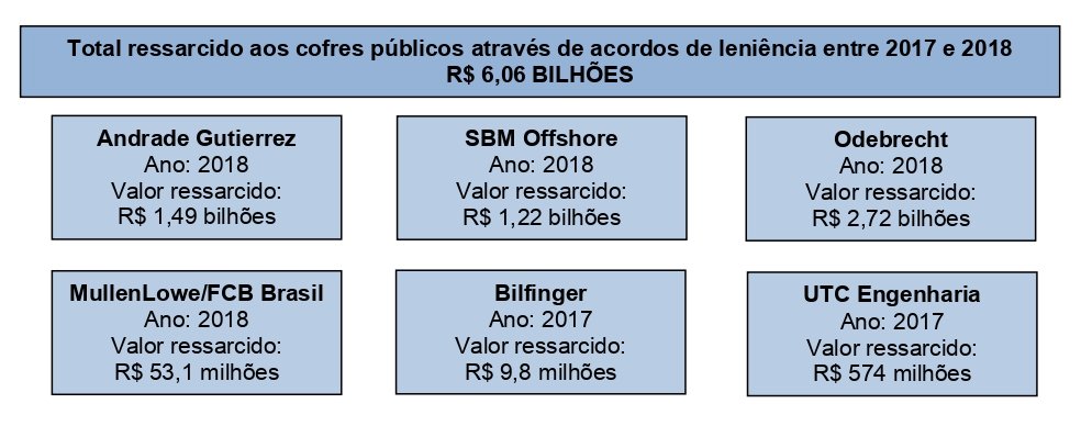 Dentre os exemplos de destaque no cenário nacional é possível destacar os acordos de leniência estipulados entre a Controladoria Geral da União e as empresas envolvidas em fraudes contra a administração pública investigadas entre os anos de 2017 e 2018.